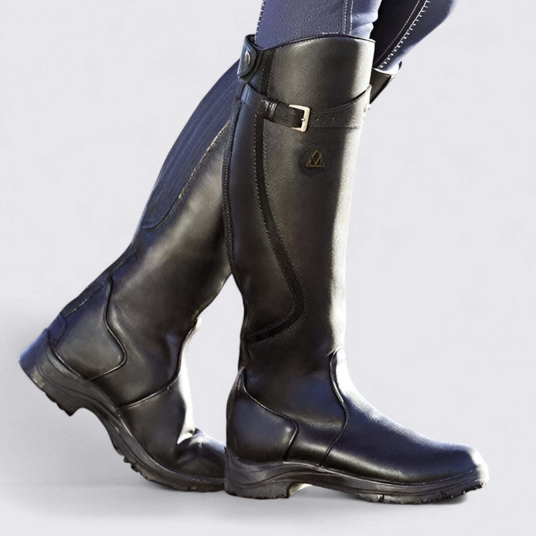 Pull-on entry with adjustable calf strap detail.