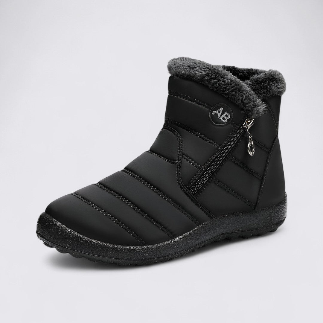 A pair of boots for Women. The profile appears ankle height with a round toe. The upper shows quilted panels with horizontal lines. A side zip sits on the outer quarter. A visible collar trim frames the opening. The outsole is textured with a low profile. Intended for everyday wear during colder seasons.