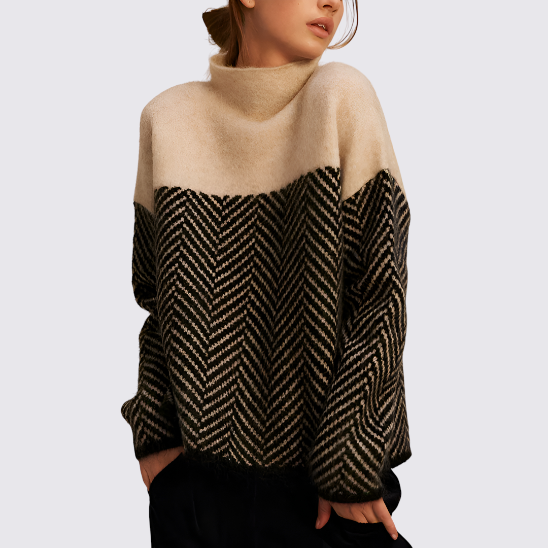 This mock-neck sweater is designed for women. It features a patterned body with a plain upper section. The silhouette appears relaxed with a drop-shoulder design. Hem and cuffs include wider rib panels. The knit shows a regular chevron arrangement on the body. Edges are clean with consistent finishing and panel lines. A neutral fibre mix is assumed where material is unspecified.