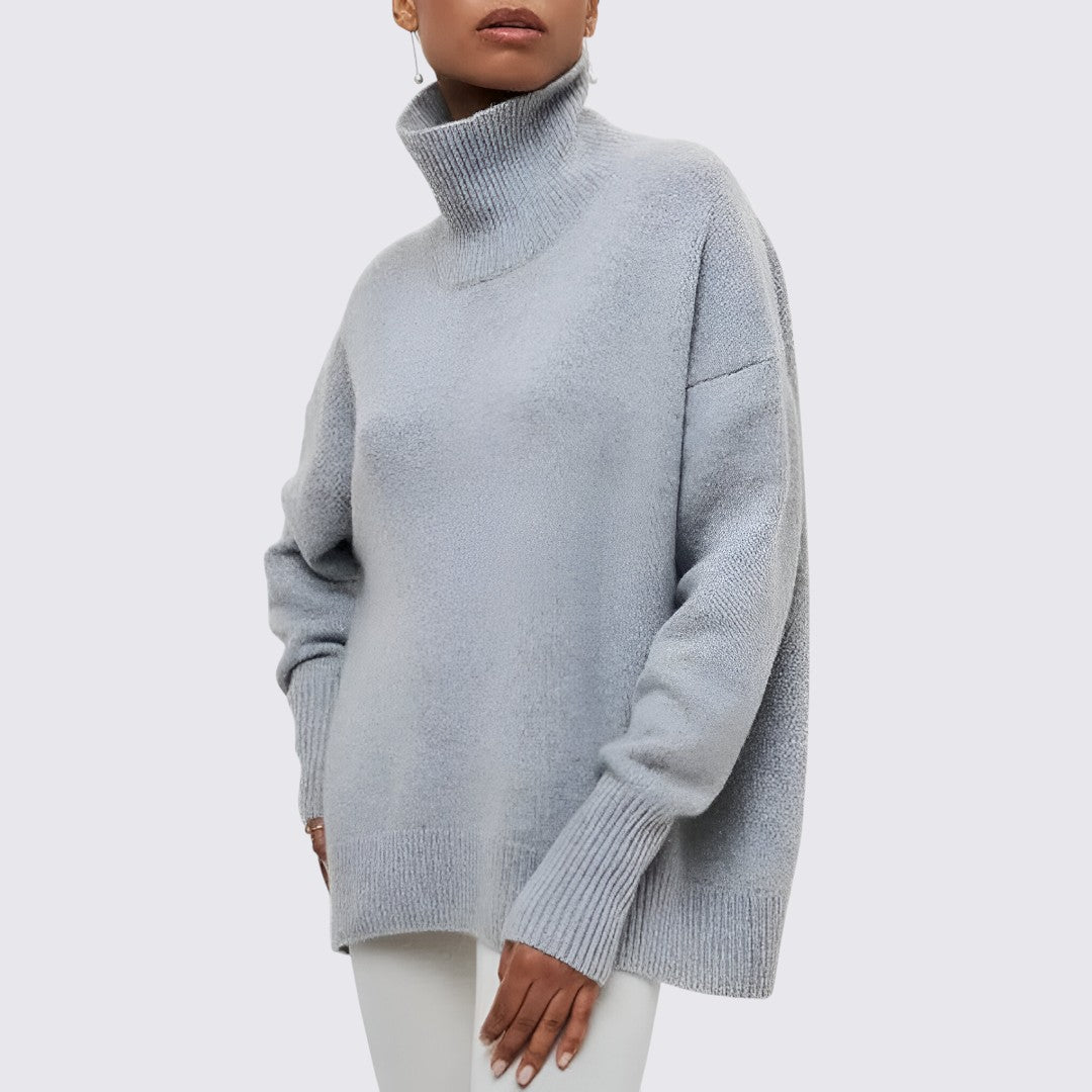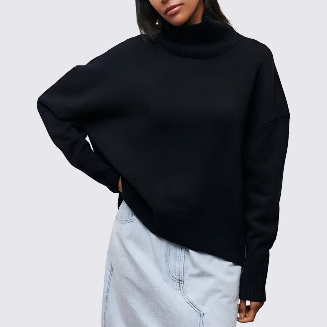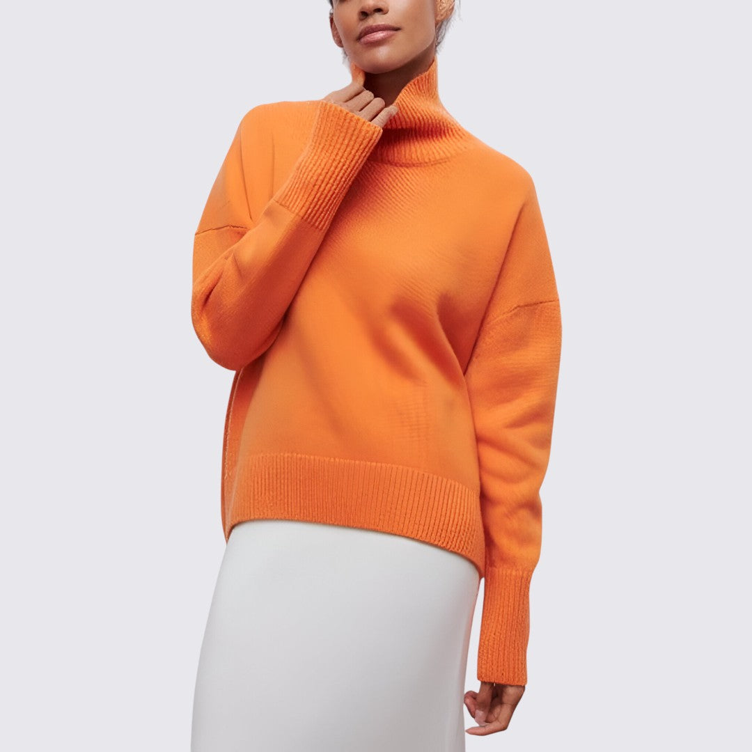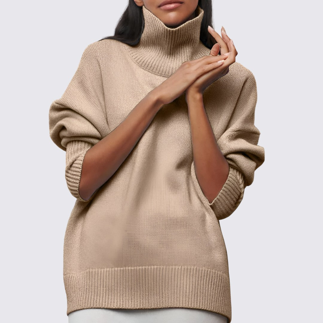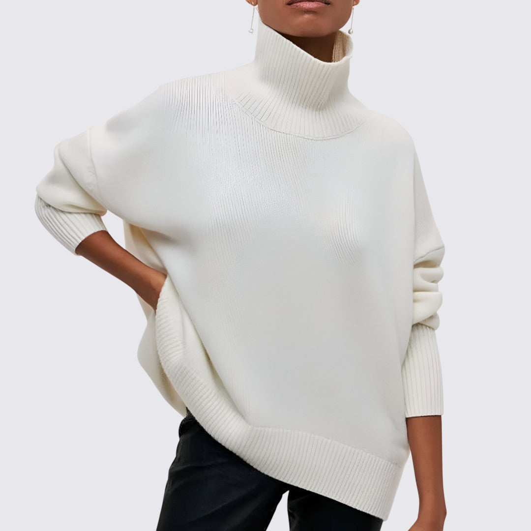This roll-neck Sweater is designed for Women. It features a high neckline with rib edging. The silhouette appears relaxed with drop-shoulder design. Hem and cuffs show wider rib panels. The knit presents a uniform surface without additional patterns. Length falls to hip area for everyday settings. A neutral fibre mix is assumed where material is unspecified.