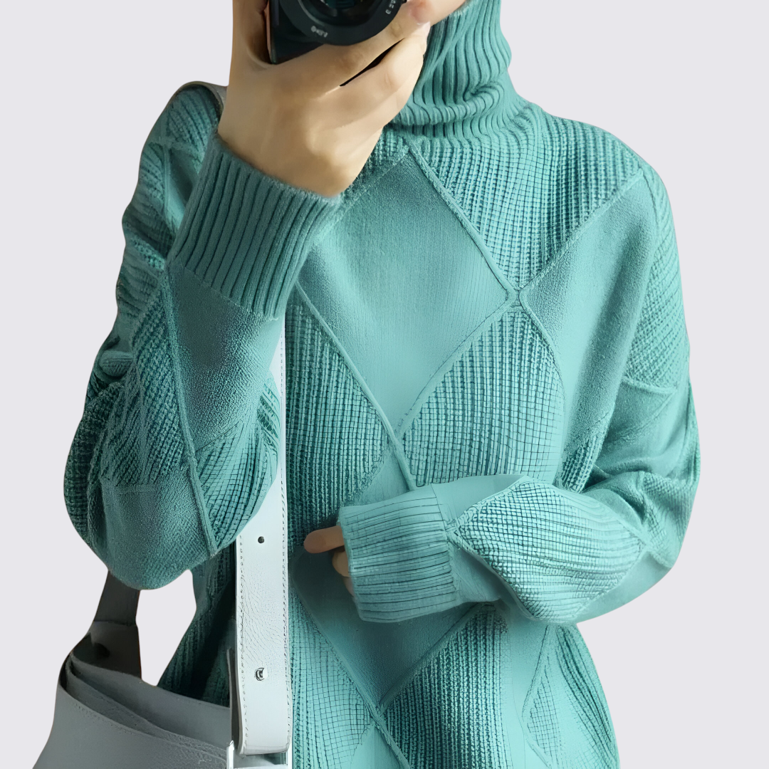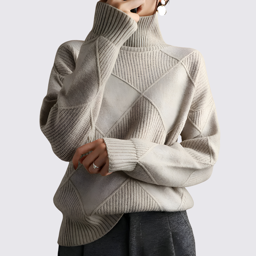 This roll-neck sweater is designed for women. The knit shows panelled sections with rib segments. The silhouette appears relaxed with a straight hem. Sleeves are long and finished with rib cuffs. The neckline sits higher to cover the neck. Surface appearance is uniform across the garment panels. Suitable for layering in cooler transitional periods.